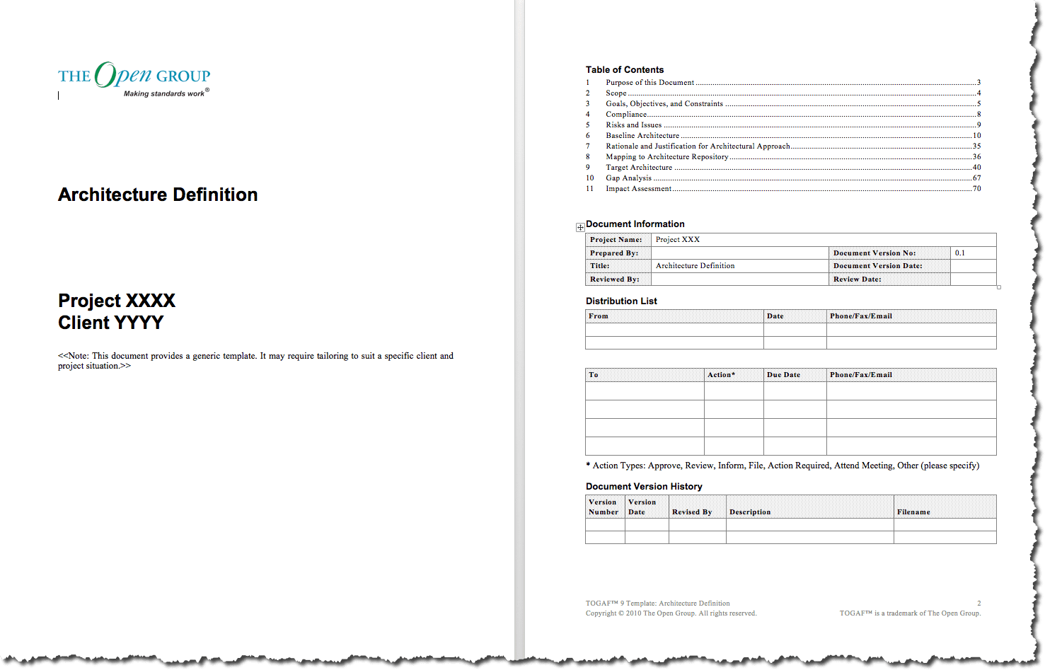 This TOGAF Architecture Definition (AD) Template is an excellent document which can be used to create many other types of documents. It is offered as a guide – with embedded descriptions as to the content in each of the sections.